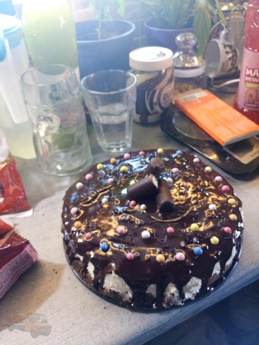 A 2 órán át pihent tortát kivesszük a tortaformából, majd gőz fölött a tábla étcsokit és a 100 ml habtejszínt összemelegítjük. Kevergessük, majd mikor sűrű masszává elegyedett, rácsurgatjuk a tortára. Gyorsan kell vele dolgozni, mert hamar megköt.