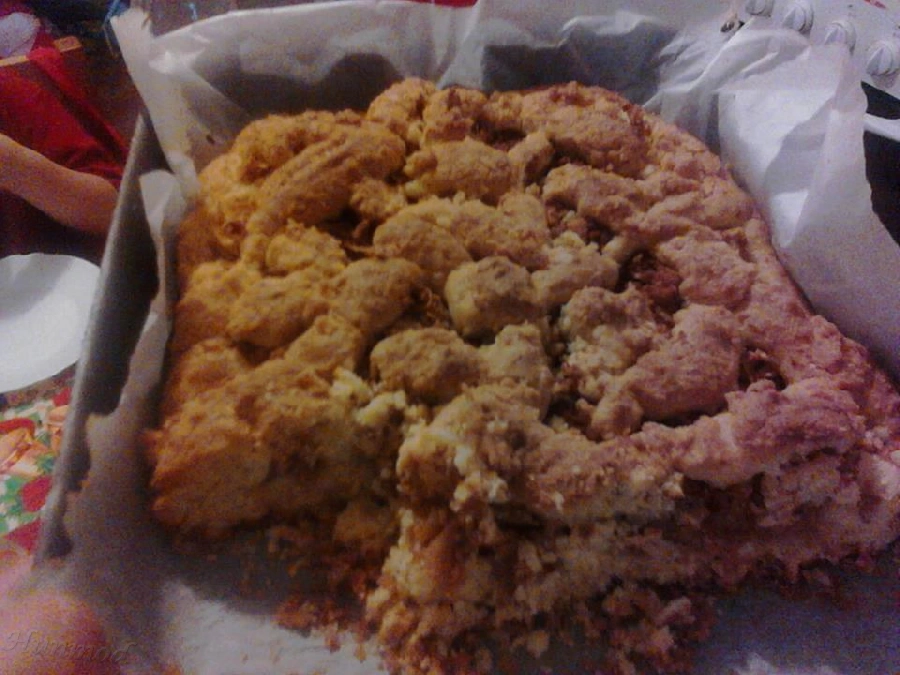 A tészta nagy részét egy kanál segítségével lapogasd el egy sütőpapírral bélelt tepsiben, majd tedd rá a fent említett állapotban lévő almát, s a tésztánk kisebb részéből készíts a tetejére rácsokat, vagy ahhoz hasonló képződményeket.