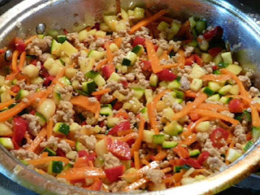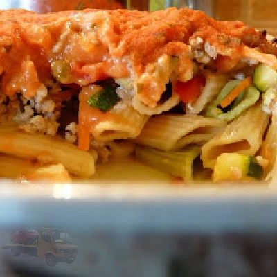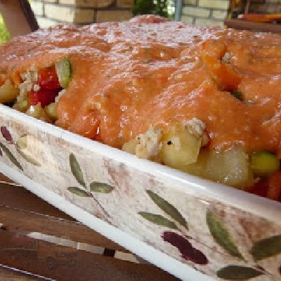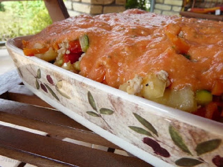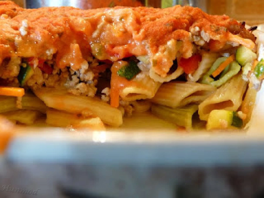 Tűzálló tálat kivajazok, beleteszem a tésztát, rászedem a zöldséges húst és ráöntöm a paradicsomszószt.