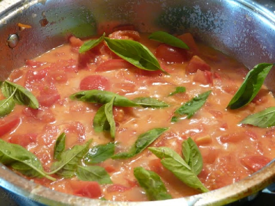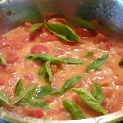 Kevés olajon illatozásig pirítom a fokhagymát, beleteszem a feldarabolt paradicsomokat, sózom, borsozom. Amikor levet enged, hozzáadom a paradicsomlevet és fedő alatt pár percig párolom. Közben a zabtejszínt elkeverem a keményítővel, majd a tűzről levett paradicsomhoz keverem, ekkor teszem bele a bazsalikomot is. Folyamatos keverés közben besűrítem a ragut.