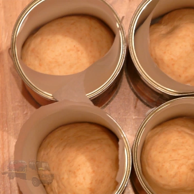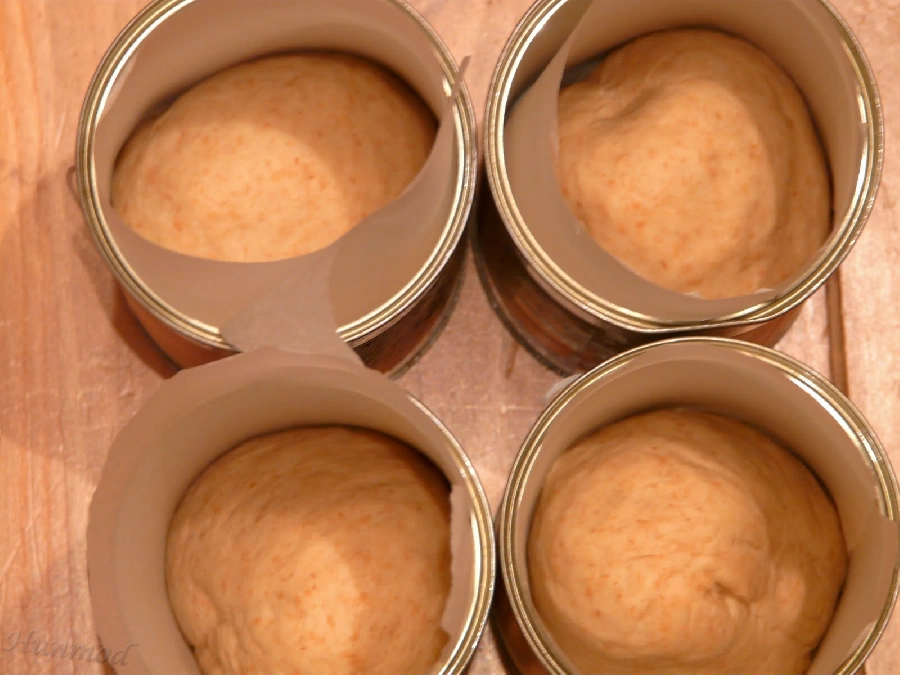 Amikor a tészta megkelt átgyúrtam, 4 egyenlő részre osztottam. Hengert formáztam belőlük, és beleállítottam a konzervdobozokba.