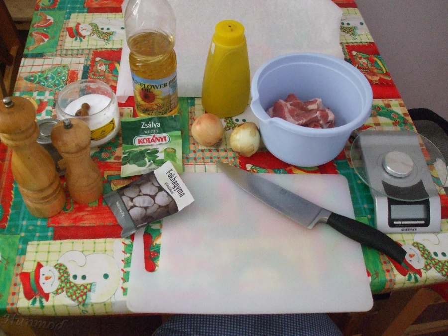 közbe rászórjuk a hagymát, és amikor a husi mind két fele fehéres, mehet bele a mustár is.