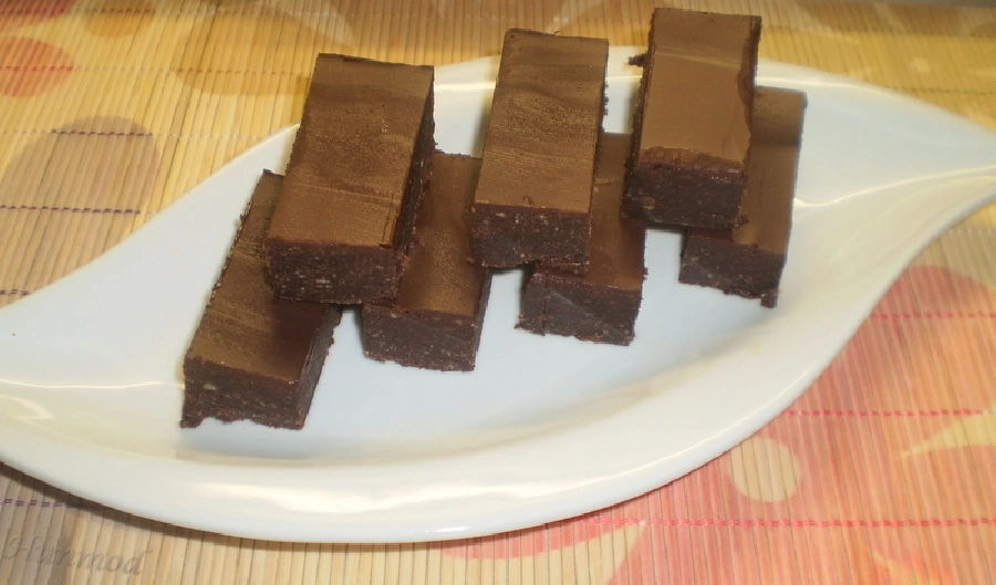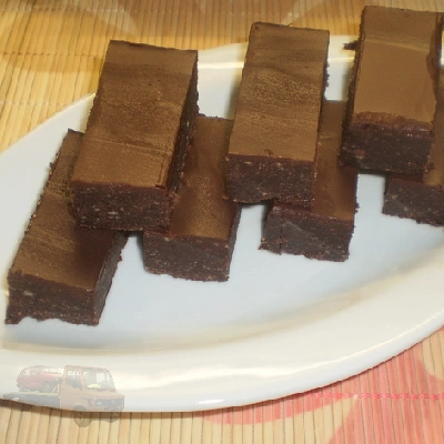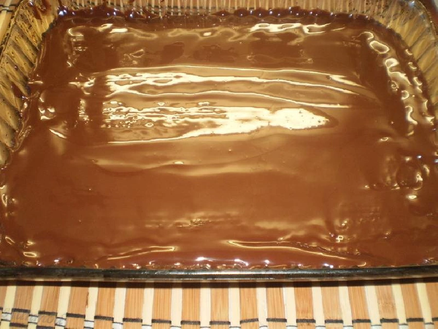 Hűtőbe tesszük, amíg a csoki teljesen megdermed, majd forró vízbe mártott késsel szeleteljük.