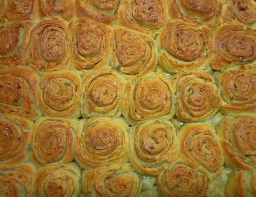 A tészta nagyobbik felét is kinyújtom ,megkenem a töltelékkel,