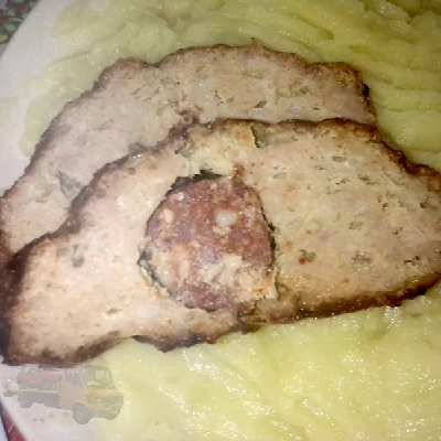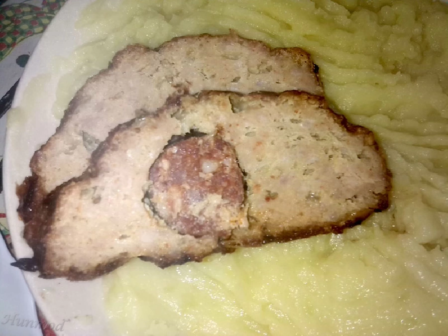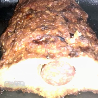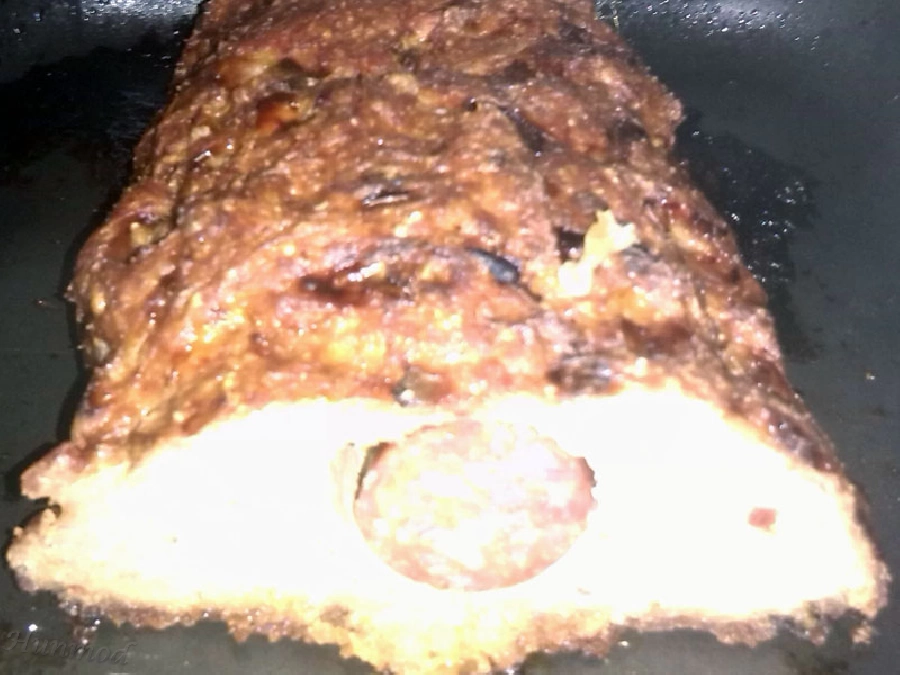 egy tepsibe rakjuk a húsmasszát, hosszában széthúzzuk egyenletesen, és a közepébe tesszünk egy szál kolbászt.